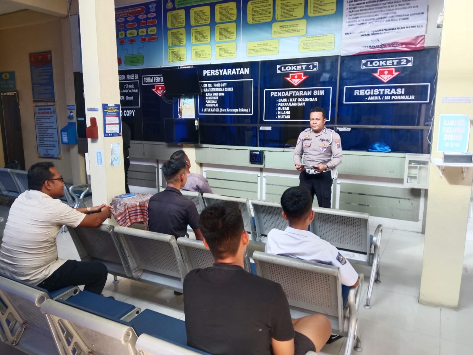 Masyarakat yang sedang mengantri diberikan penjelasan mengenai pentingnya kelengkapan surat-surat kendaraan sebagai bagian dari budaya tertib berlalu lintas.