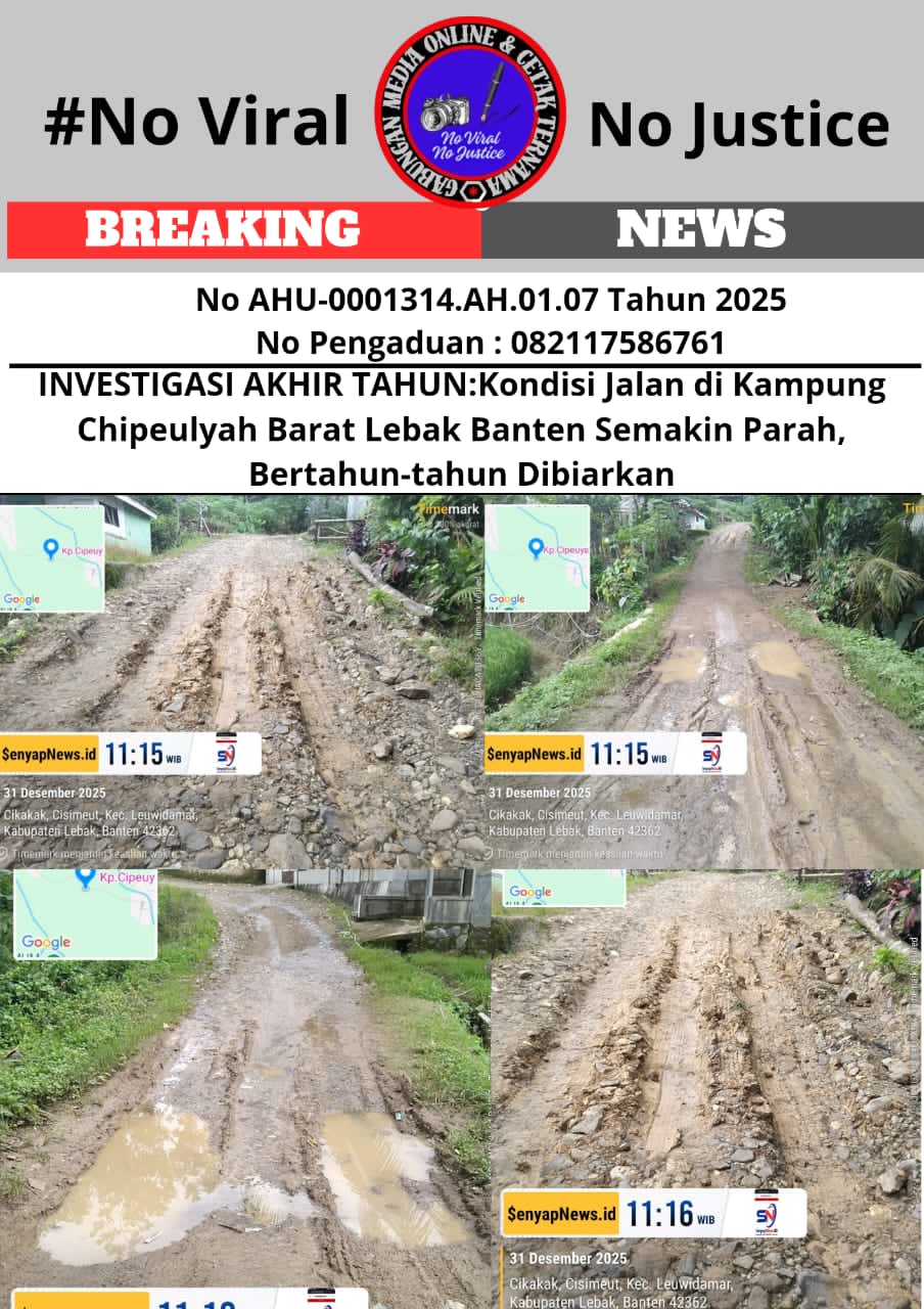 Kerusakan akses jalan di Kampung Chipeulyah Barat, RT/RW 002/006 Desa Cisimeut, Kecamatan Leuidamar, Kabupaten Lebak, semakin memburuk. Bertahun-tahun dibiarkan tanpa perbaikan, jalan yang menjadi jalur utama mobilitas masyarakat sekitar kini dipenuhi barisan lubang besar yang seperti kubakan kerbau, genangan air di mana-mana, dan permukaan bergelombang yang membahayakan aktivitas pengguna jalan pada Rabu (31/12/2025).
