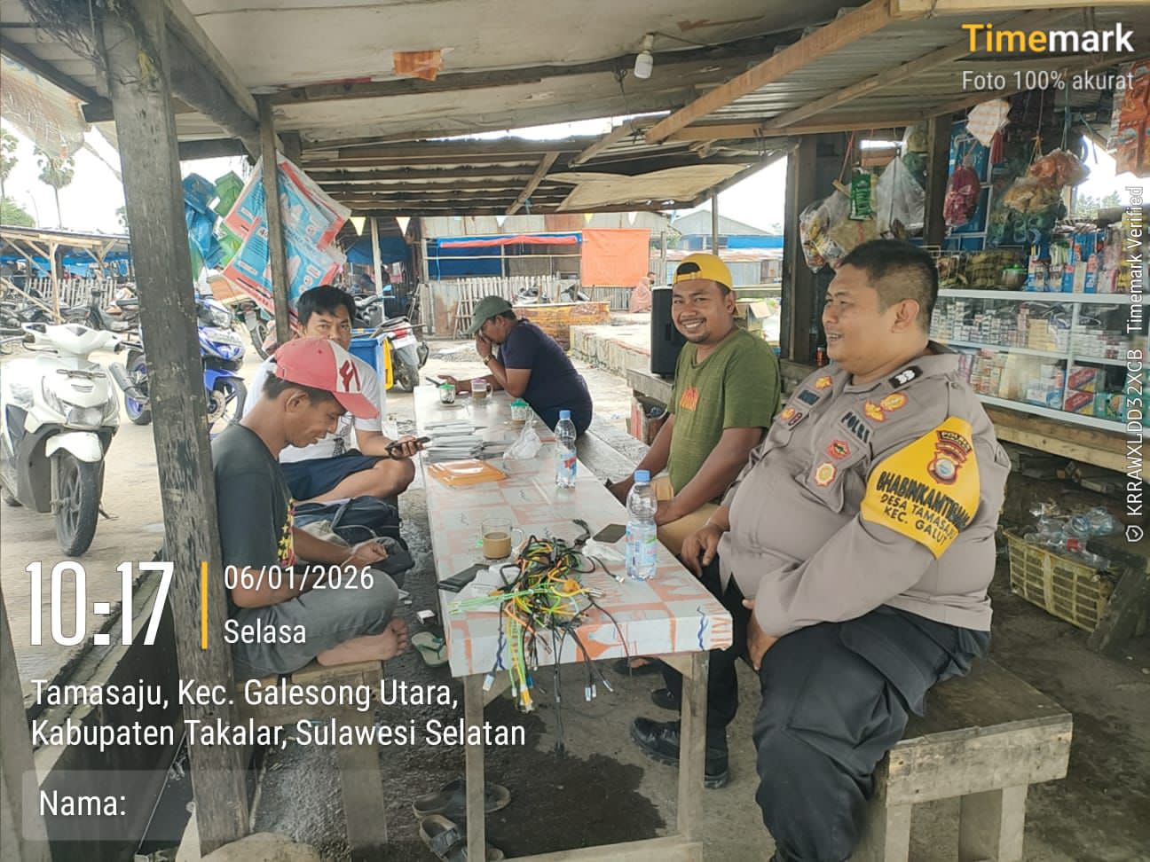 Takalar -!Dalam rangka mendekatkan diri dengan masyarakat sekaligus memastikan situasi keamanan tetap kondusif, Bhabinkamtibmas Desa Tamasaju, Aiptu Herman, melaksanakan kegiatan sambang dan silaturahmi di Tempat Pelelangan Ikan (TPI) Beba, Dusun Beba, Desa Tamasaju, Kecamatan Galesong Utara, Kabupaten Takalar, pada Selasa (06/01/2026) pagi.