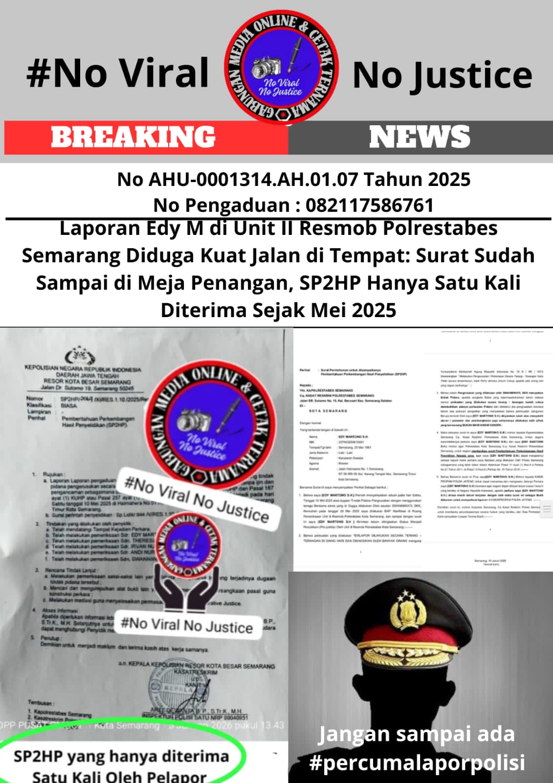 SEMARANG, 27 JANUARI 2026 (GMOCT) — Pelaporan yang dilakukan Edy M S.H. terkait dugaan tindak pidana pembongkaran dan pengrusakan bangunan miliknya yang dilakukan oleh Swanniwati telah masuk ke penanganan Resmob Unit II Polrestabes Semarang. Hal ini dikonfirmasi setelah tim liputan khusus GMOCT (Gabungan Media Online dan Cetak Ternama) melakukan verifikasi ke bagian penerimaan surat Polrestabes Semarang dan langsung kepada Aiptu Nanang Supriyanto S.H., petugas yang menangani kasus tersebut di Unit II Resmob.