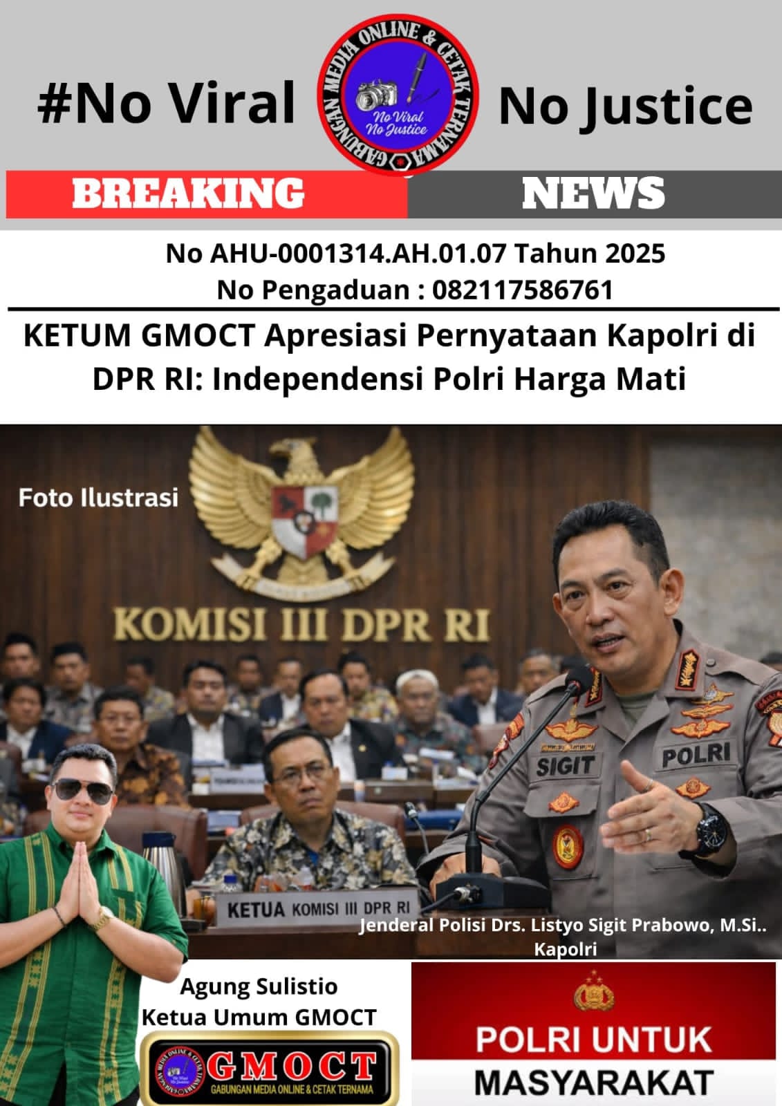 Semarang, Rabu (28 Januari 2026) – Ketua Umum Gabungan Media Online dan Cetak Ternama (GMOCT) Agung Sulistio menyampaikan apresiasi dan dukungan penuh terhadap sikap tegas Jenderal Listyo Sigit Prabowo yang menolak wacana penempatan Kepolisian Negara Republik Indonesia (Polri) di bawah kementerian. Informasi ini diperoleh dari media online Sahabat Bhayangkara Indonesia (Kabarsbi.com) yang tergabung dalam GMOCT.