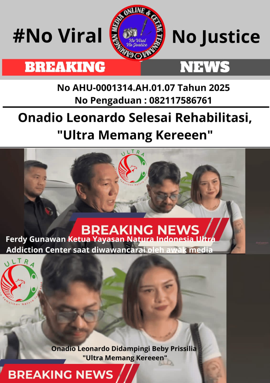 Jakarta Selatan, 28 Januari 2026 – Artis Onadio Leonardo telah menyelesaikan masa rehabilitasi yang dimulai sejak tanggal 04 November 2025 di Yayasan Rehabilitasi Natura Indonesia Ultra Addiction Center, berlokasi di Jalan Pertanian Raya No.59 B, RT.004/RW.004, Lebak Bulus, Kecamatan Cilandak, Kota Jakarta Selatan.