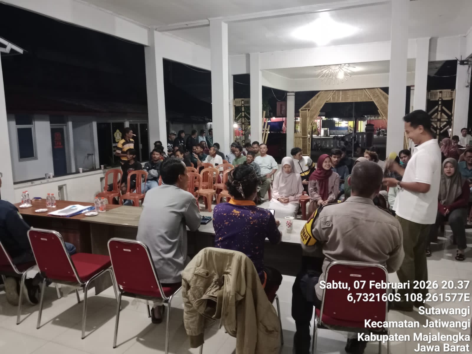Majalengka – Bhabinkamtibmas Polsek Jatiwangi Polres Majalengka melaksanakan kegiatan menghadiri Sosialisasi Pergantian Antar Waktu (PAW) Karang Taruna “Muda Karya Mandiri” Desa Sutawangi, Kecamatan Jatiwangi, Kabupaten Majalengka, pada hari Sabtu, 7 Februari 2026, pukul 20.00 WIB, bertempat di Balai Desa Sutawangi.