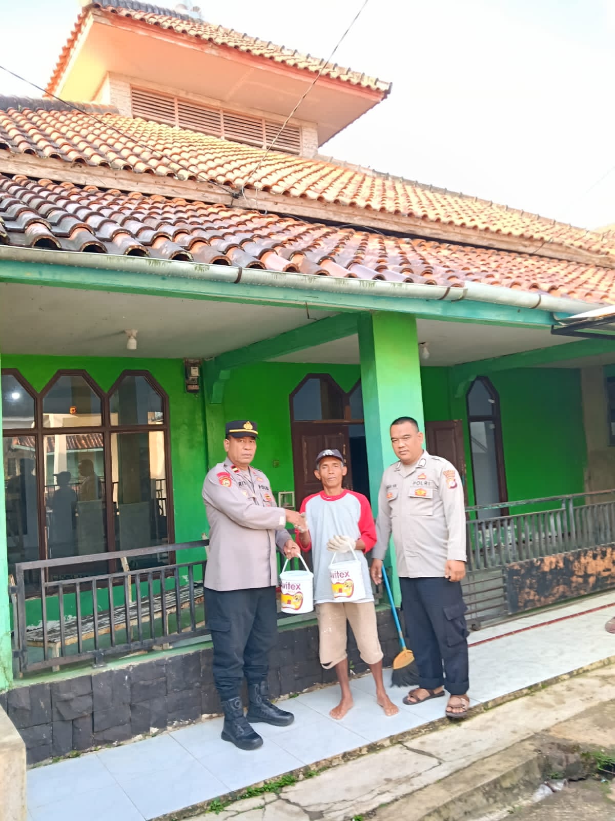 Polsek Malausma Polres Majalengka menunjukkan kepedulian terhadap fasilitas ibadah dengan memberikan bantuan material berupa Cat untuk Pengecetan dinding yang sudah kusam.