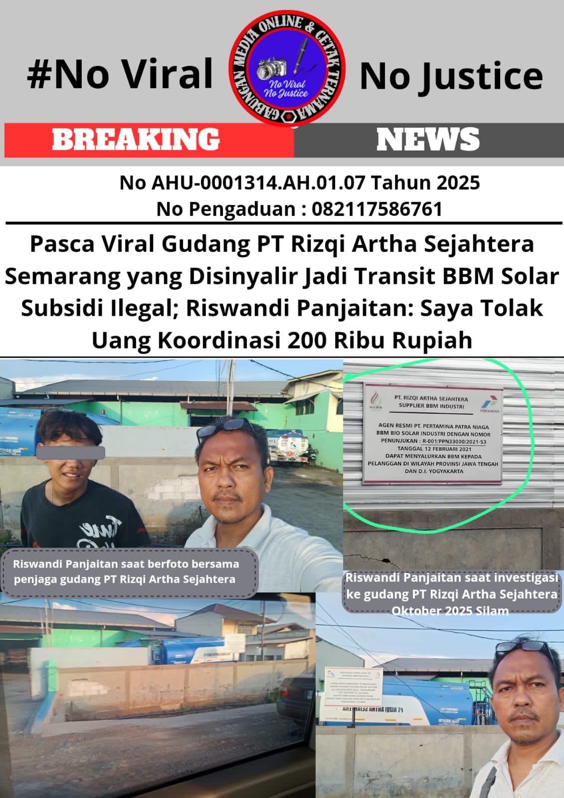 Pasca Viral Gudang PT Rizqi Artha Sejahtera Semarang yang Disinyalir Jadi Transit BBM Solar Subsidi Ilegal; Riswandi Panjaitan: Saya Tolak Uang Koordinasi 200 Ribu Rupiah