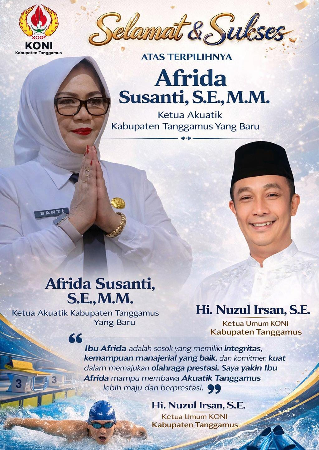 Atas terpilihnya Afrida Susanti, Ketua Umum KONI Kabupaten Tanggamus, Hi. Nuzul Irsan, S.E., menyampaikan ucapan selamat dan apresiasi atas amanah yang diberikan kepada Afrida Susanti sebagai pimpinan baru cabang olahraga akuatik.