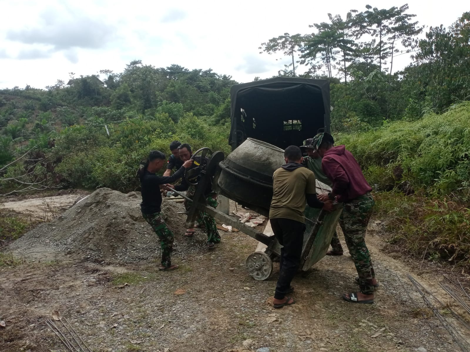 Untuk mendukung pelaksanaan pekerjaan, para anggota satgas menurunkan peralatan berat berupa mesin molen beton untuk mempermudah proses pengecoran. Kegiatan ini dilaksanakan pada Sabtu (21/02/2026).