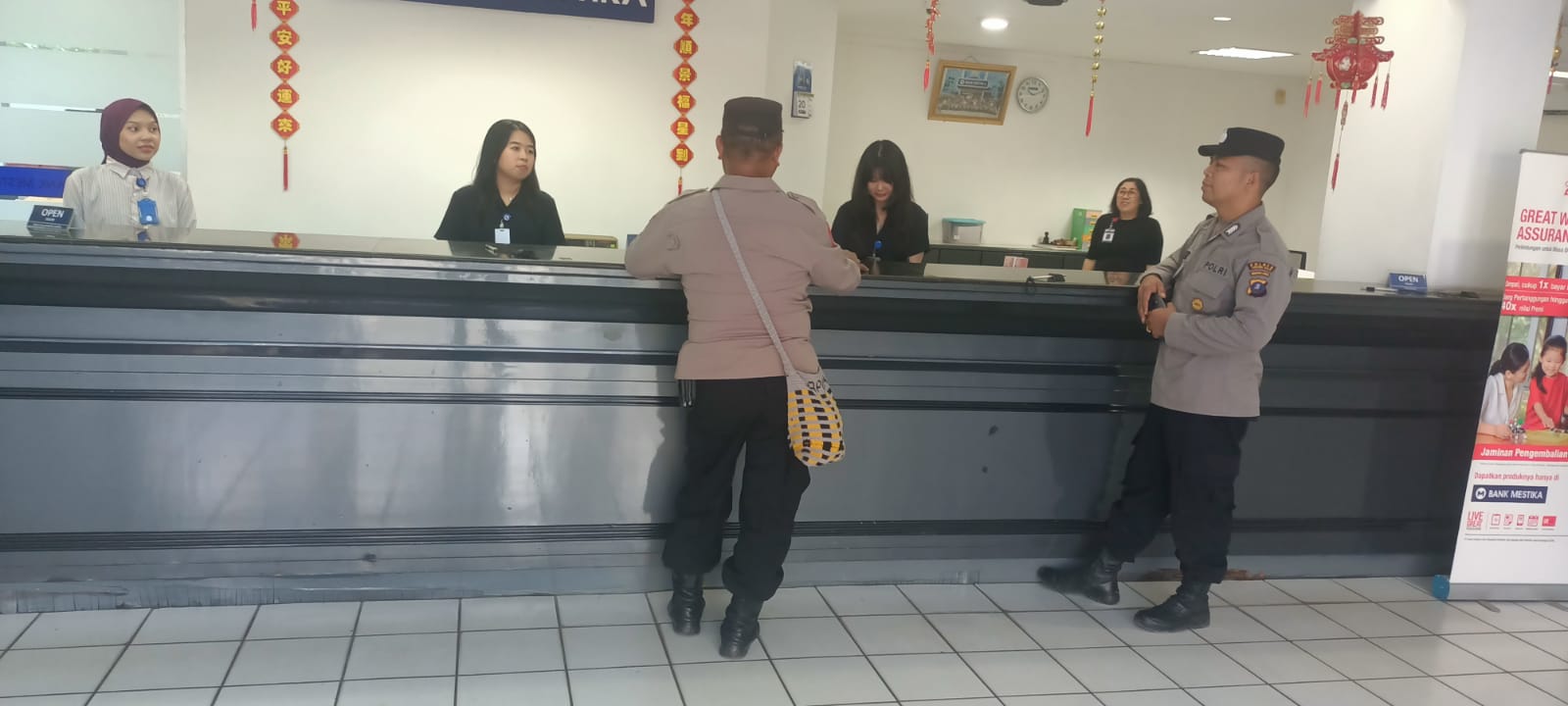 Pada Senin (23/02/2026), personel kepolisian melakukan koordinasi keamanan di Bank Mestika, Jalan T. Umar, Kota Tanjung Balai.