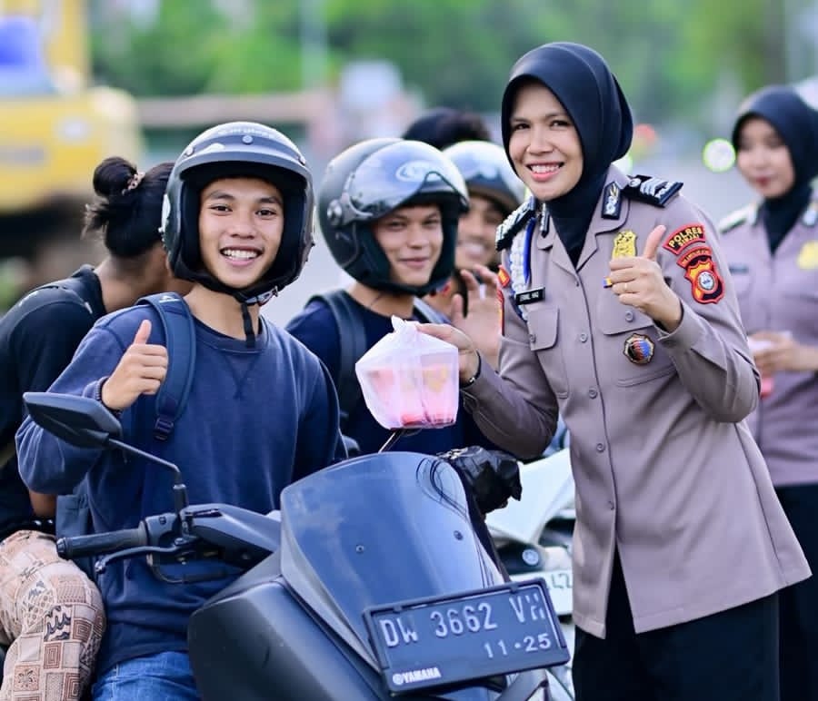 Dengan senyum ramah dan sapaan hangat, para Polwan menyambut pengendara roda dua, roda empat, hingga pejalan kaki yang melintas.
