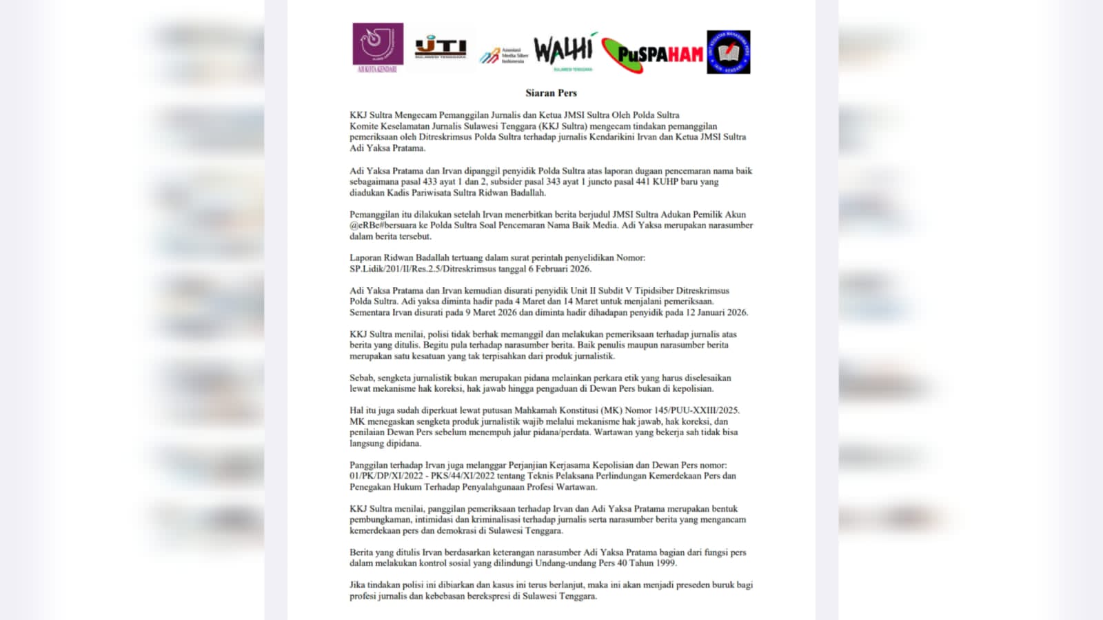 Kendari – Komite Keselamatan Jurnalis Sulawesi Tenggara (KKJ Sultra) mengecam pemanggilan jurnalis Kendarikini, Irvan, dan Ketua JMSI Sultra, Adi Yaksa Pratama, oleh penyidik Ditreskrimsus Polda Sultra, Rabu (11/3/2026).