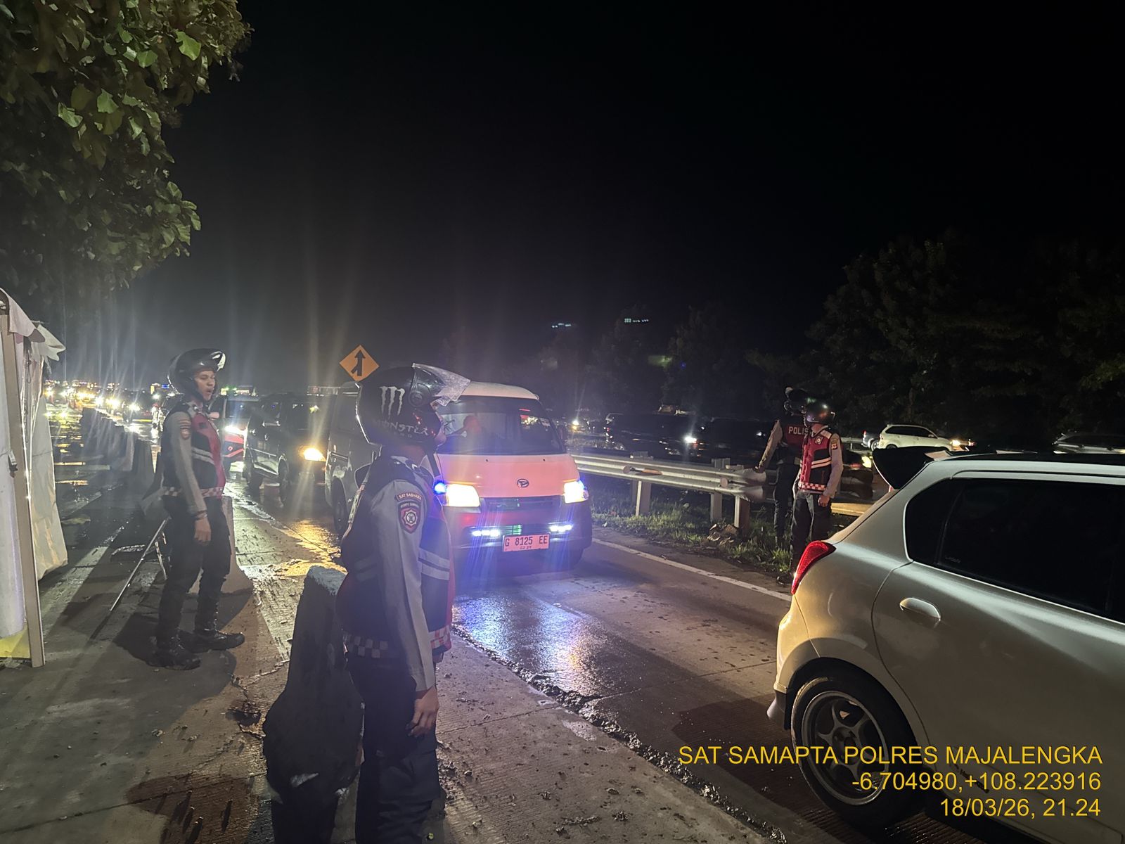 “Sesuai arahan Kapolres Majalengka AKBP Rita Suwadi, S.H., S.I.K., M.M., anggota Sat Samapta disiagakan untuk mengurai kepadatan kendaraan di KM 164 B agar tidak terjadi penumpukan yang panjang. Selain itu, petugas melakukan patroli untuk memastikan keamanan para pemudik dari gangguan kamtibmas di sepanjang jalur tol pada malam hari,” ujar Iptu Dedi Sutikno.