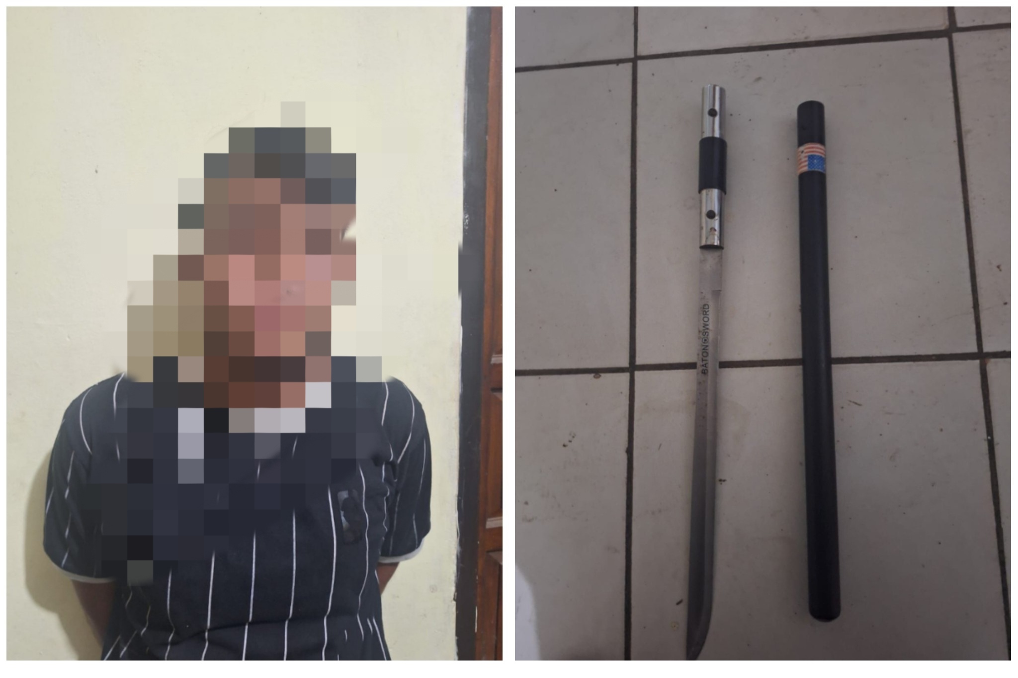 Saat dilakukan pemeriksaan, petugas mendapati pria tersebut membawa senjata tajam berupa pisau jenis baton stick sepanjang kurang lebih 90 cm lengkap dengan sarungnya.