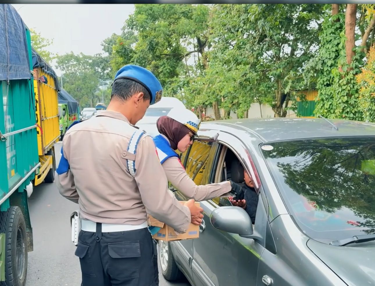 Petugas Satlantas dengan ramah menyapa dan membagikan konsumsi kepada pengendara roda dua maupun roda empat yang berada di lokasi pending. Suasana pun terasa lebih hangat dan humanis di tengah kepadatan arus lalu lintas.