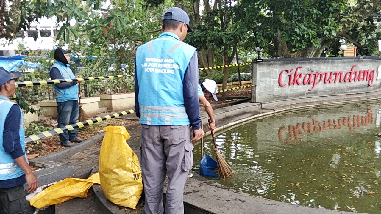 Tim Dinas Lingkungan Hidup dan Kebersihan (DLHK) Kota Bandung dari Zona 11B Cibeunying turun langsung membersihkan area kolam dan sekitarnya pada Kamis (26 Maret 2026). Sebanyak 14 petugas diterjunkan dalam kegiatan tersebut, dipimpin oleh Usep Sumarna (52), selaku Koordinator Lapangan.