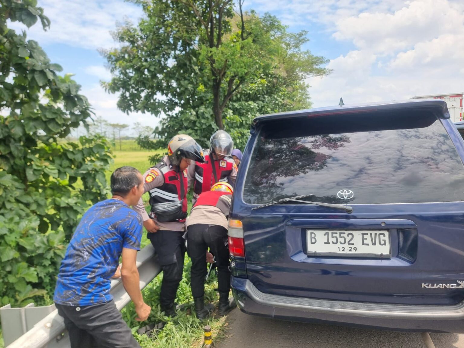 Kejadian bermula saat personel Sat Samapta tengah melaksanakan patroli dalam rangka Kegiatan Rutin Yang Ditingkatkan (KRYD) untuk mengantisipasi lonjakan arus balik gelombang kedua. Petugas mendapati satu unit kendaraan Toyota Kijang yang terparkir di bahu jalan tol dengan kondisi ban belakang bagian kiri pecah. Melihat hal tersebut, anggota kepolisian langsung menghampiri pengendara guna memberikan bantuan keamanan dan teknis di lokasi.