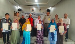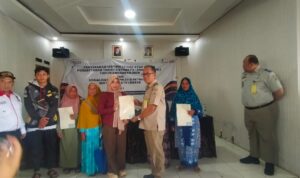 Penyerahan sertipikat dilakukan secara simbolis kepada beberapa warga penerima, kemudian dilanjutkan dengan pembagian secara menyeluruh kepada seluruh penerima manfaat. Warga terlihat antusias dan bersyukur atas sertipikat yang telah mereka terima.