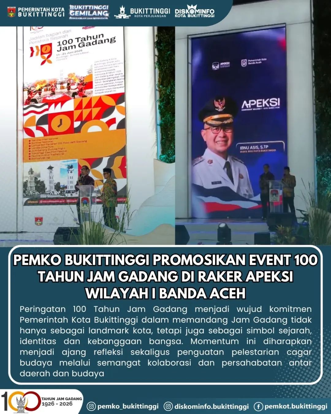 Reformasiaktual.com//Banda Aceh — Pemerintah Kota Bukittinggi promosi dan sosialisasikan event Peringatan 100 Tahun Jam Gadang dalam Rapat Kerja APEKSI Komisariat Wilayah I yang berlangsung di halaman Balee Meuseuraya Aceh, Minggu, 19 April 2026.