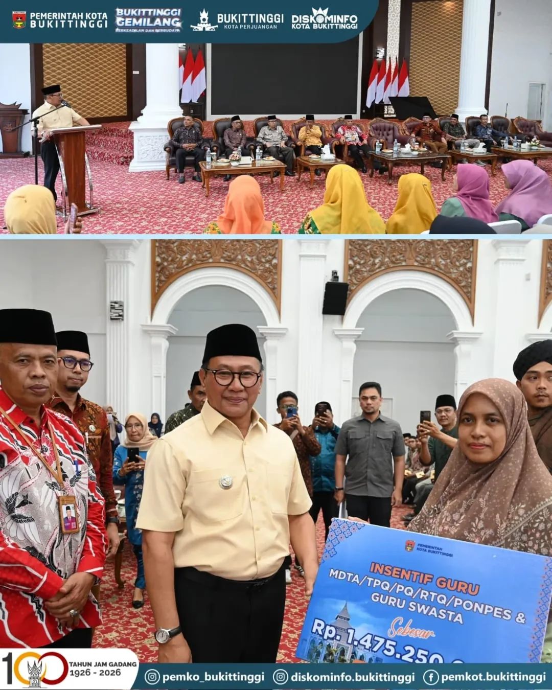 Reformasiaktual.com//Pemerintah Kota Bukittinggi menyerahkan honor kepada guru MDTA/TPQ/PQ/RTQ, pondok pesantren, guru swasta serta garin masjid dan mushalla se-Kota Bukittinggi. Penyerahan dilakukan secara simbolis oleh Wali Kota Bukittinggi, Ramlan Nurmatias, di Balairung Rumah Dinas Wali Kota, Kamis, 23 April 2026.