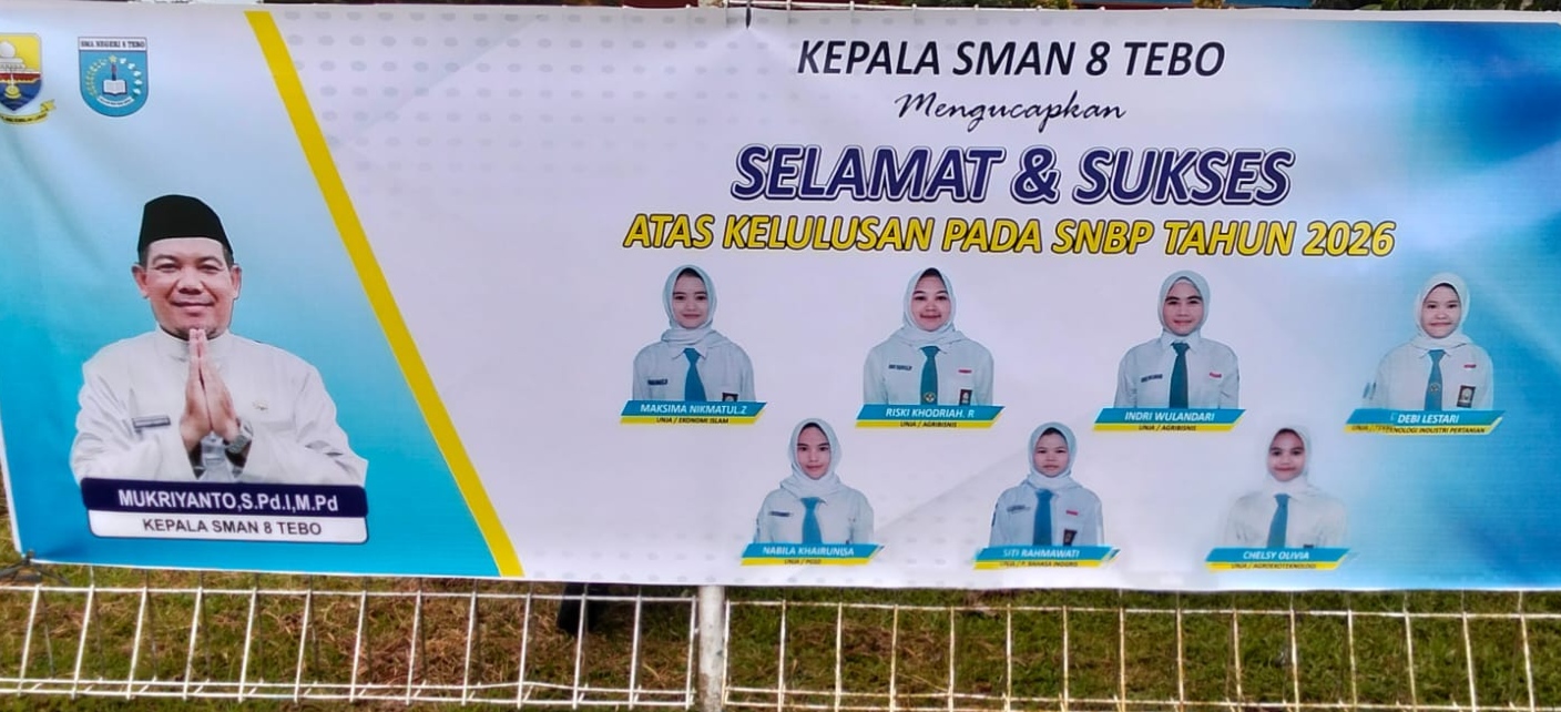“Mukrianto, S.Pd.I., M.Pd., Kepala Sekolah SMAN 8 Kabupaten Tebo saat di konfirmasi media ini menyampaikan, Alkhamdulillah di Tahun Ajaran 2025-2026 SMAN 8 siswanya lulus di SNBP sebanyak 7 Siswa meningkat dari pada tahun kemarin, rata rata yang lulus ini sudah mendaftar di Universitas Propinsi Jambi.