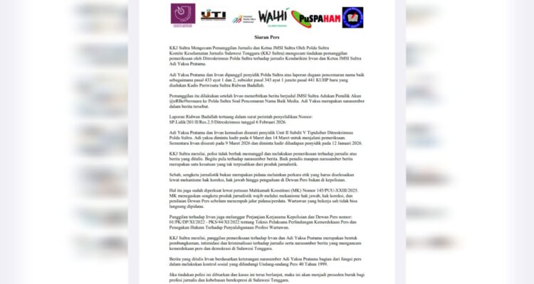 reformasiaktual.com//Kendari – Komite Keselamatan Jurnalis Sulawesi Tenggara (KKJ Sultra) mengecam pemanggilan jurnalis