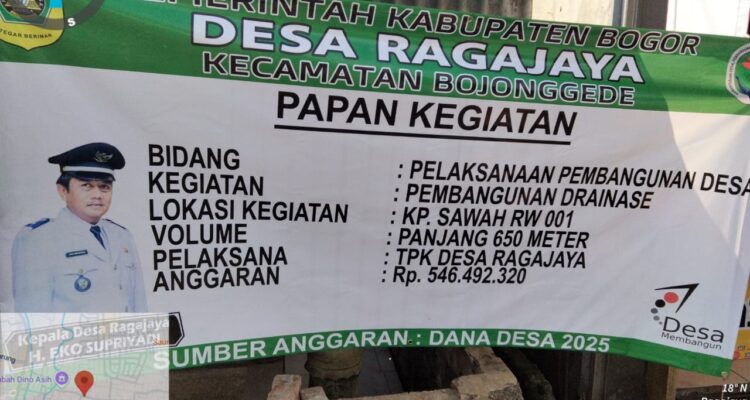 Reformasiaktual.com//Bogor – Proyek pembangunan drainase di Kampung Sawah RW 001, Desa Ragajaya,